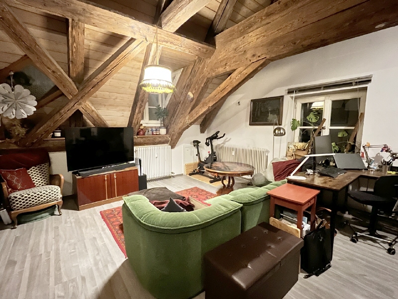 Es handelt sich um eine gepflegte 2 Zimmer-Maisonette-Wohnung im Dachgeschoss (4. OG mit Aufzug) eines 1991 kernsarnierten, denkmalgeschützten Mehrfamilienhauses. Zur Wohnung gehört noch eine Einbauküche. Balkon und PKW-Stellplatz sind nicht vorhanden.